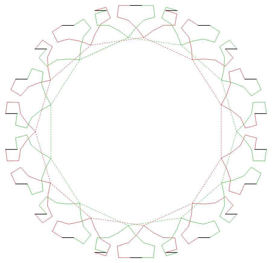 the motifs in each of the two interlaced motif subsets are located at the same radial
